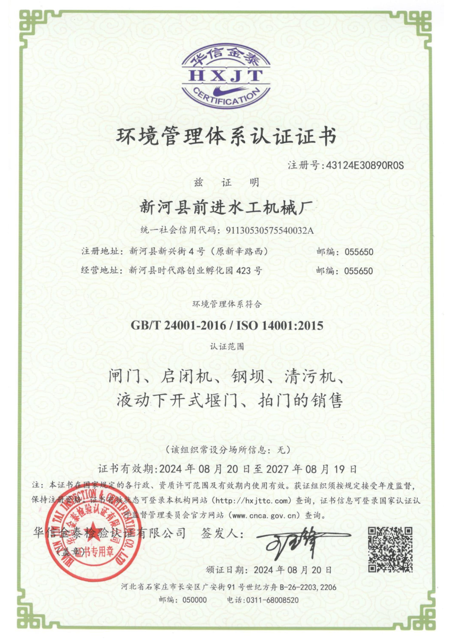新河縣前進水工機械廠是一家專門從事水利工程設備研發生產的廠家,現有員工228人,各類高、中級專業工程技術人員近30人,技術生產工人180多人。公司占地面積14674平方米。公司擁有車、鉗、刨、銑、冷作、鈑金、鑄造等,工種齊全,加工能力和技術力量雄厚,并具備理化測試手段與儀器設備。前進水工專注景觀閘門,鋼壩,合頁壩,液壓升降壩,液壓閘門,臥倒門,一字門,人字門,液壓啟閉機,卷揚啟閉機,螺桿啟閉機,清污機,除污機,閘門,拍門等設備的研發與生產,是新河水利工程產品行業的領跑者,不僅在同行業群中揭起了一次又一次的技術革新,更為水利工程企業提供了更高更大的選擇平臺。